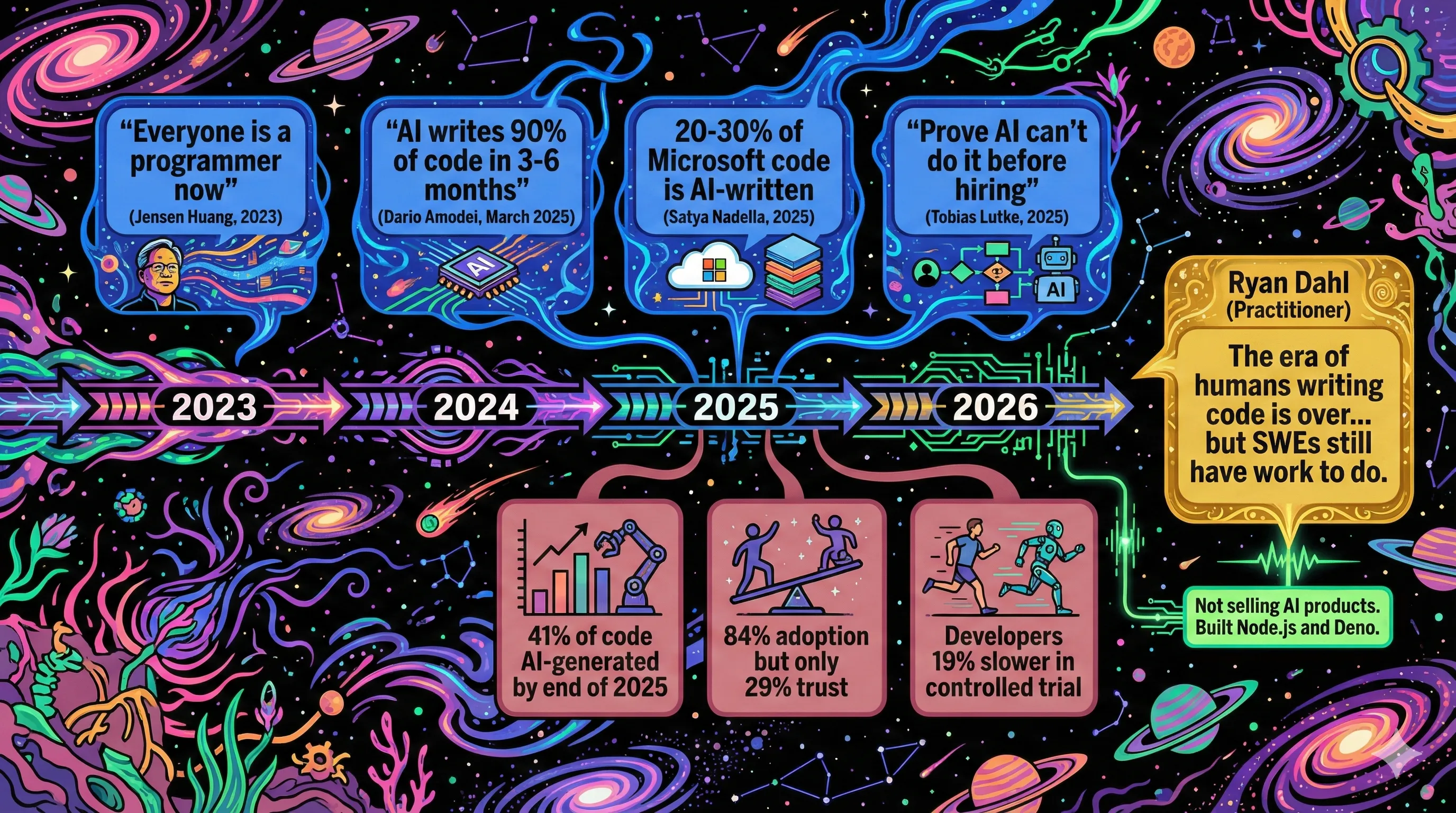 I have been managing engineering teams through the AI transition for over a year now, and I still cannot tell you whether it is making us better or just making us faster at the wrong things. So when Ryan Dahl posted in January that "the era of humans writing code is over," my first reaction was not shock. It was exhaustion. We have heard this before. But then I sat with it, and something about this particular declaration landed differently.